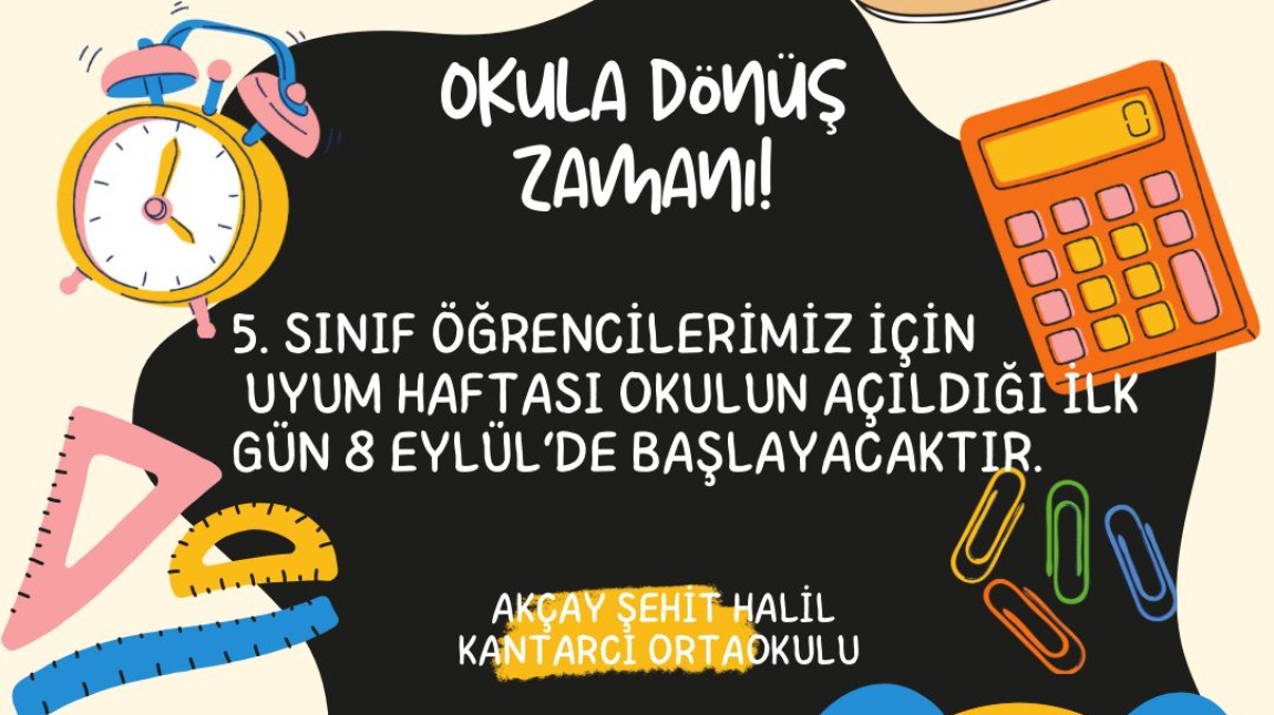 5.Sınıfa başlayacak öğrencilerimizin uyum haftası okulumuzun açıldığı ilk gün olan 8 Eylül'de başlayacaktır. Tüm öğrenci ve velilerimize duyurulur...