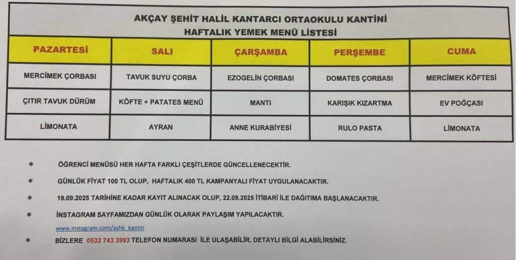 Sayın velilerimiz! Çocuklarımızın dışardan aburcubur yememesi, sağlıklı beslenmeleri için okul kantinimizde düzenli olarak yemek menüsü yapılacaktır.